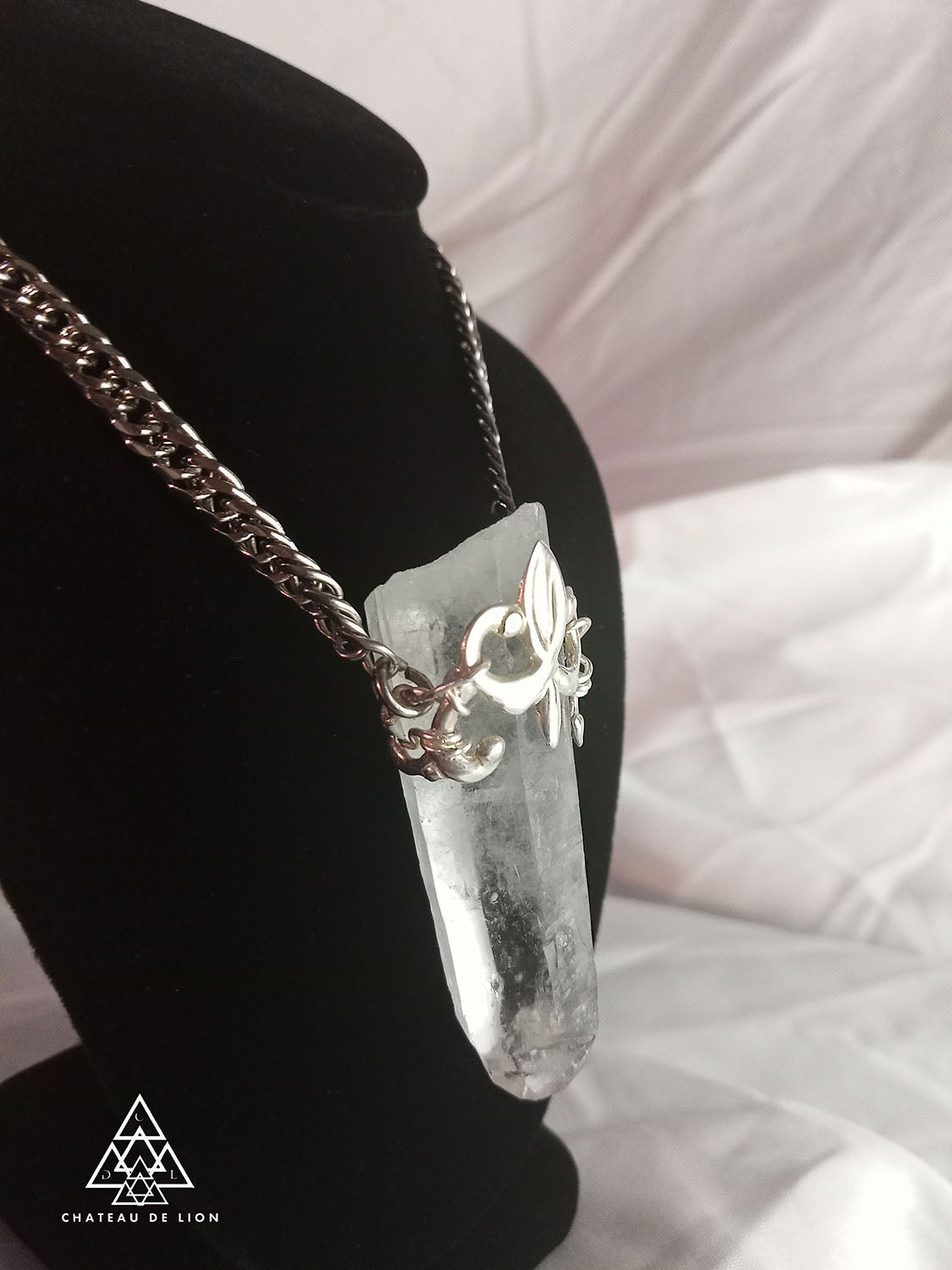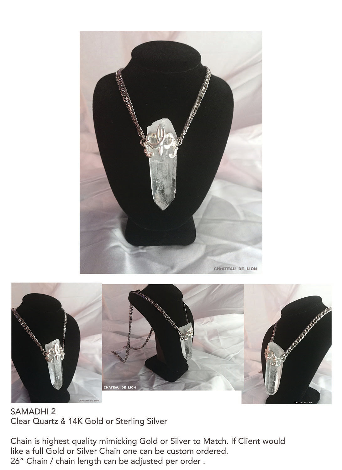 The Samadhi Clear Quartz Crystal Amulet Necklace is stunning! Made of Sterling Silver or 14K Gold double plated motif wrapped around the finest quality Activated Clear Quartz Crystal Point to bring you a powerful Amulet that not only is stylish but also brings higher positive vibrations of love and positivity to you while clearing any negative energy!
