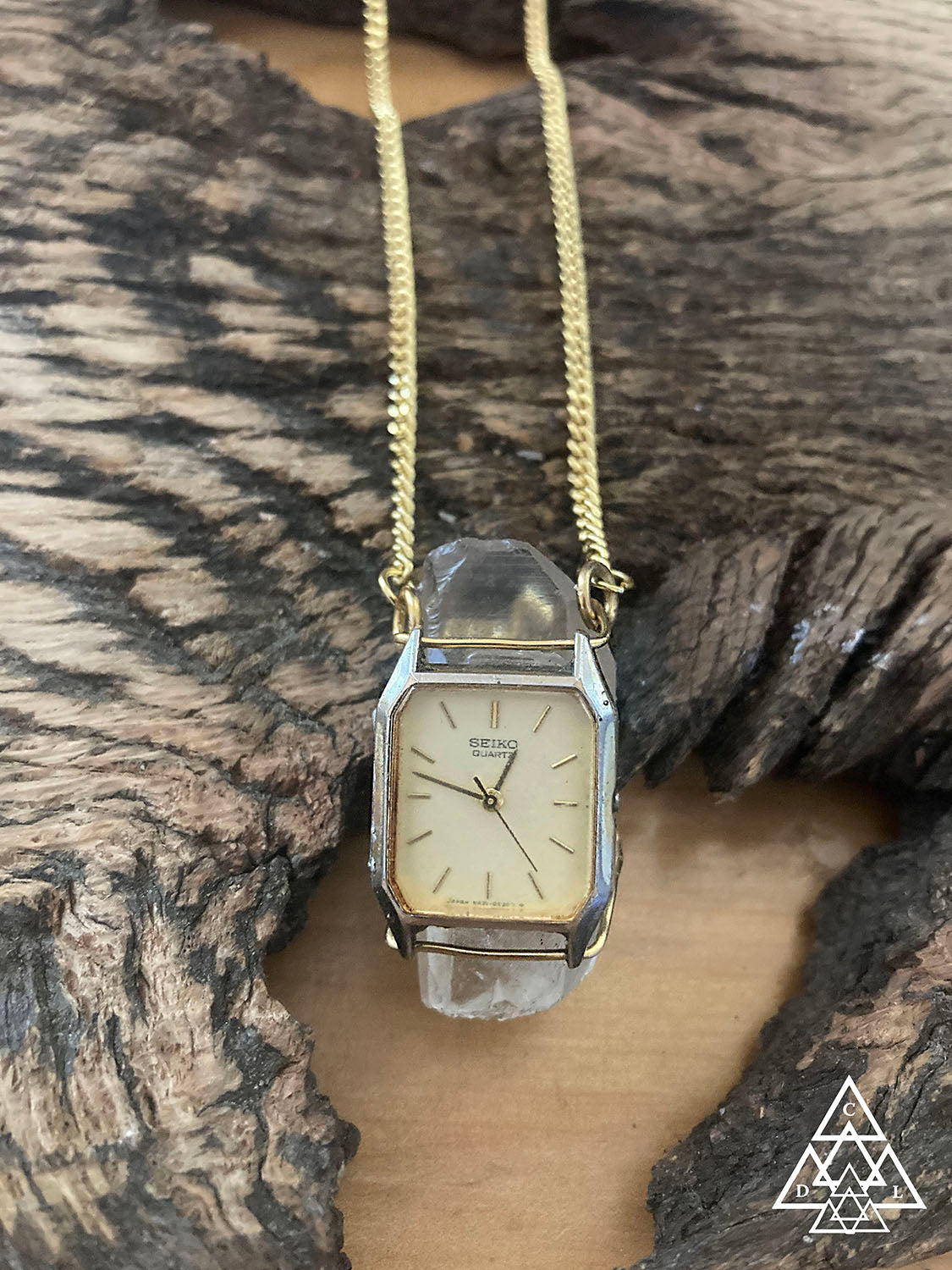 This beautiful time keeper packs some serious high vibes ! A time piece Crystal amulet necklace with a classy 23” chain and 14k gold plated clasp.