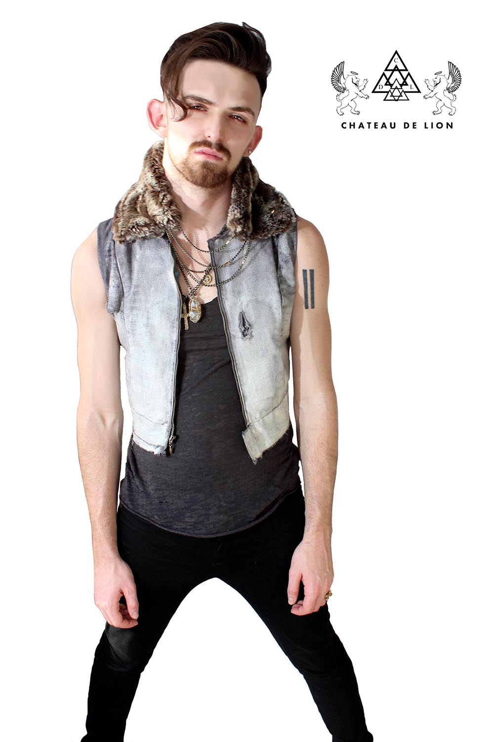The F-1 Future vest is made of finely tailored Italian Jean, fully lined and finished with brushed cotton for breathability and comfort. 2 pockets at the front princess seams. The denim is finished by hand with silvery fabric paint for a rustic futuristic finish! Created with love for the urban warrior!
